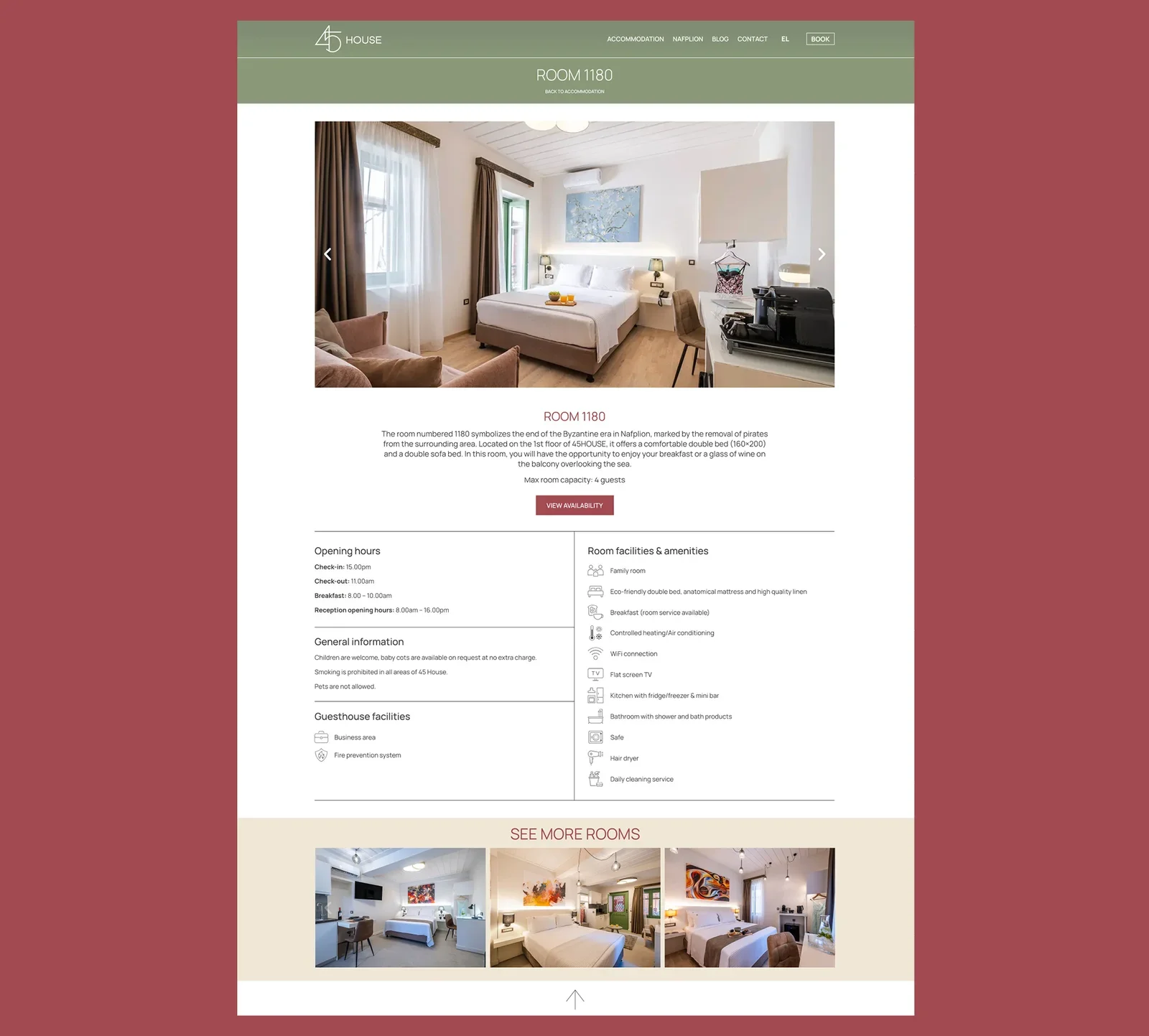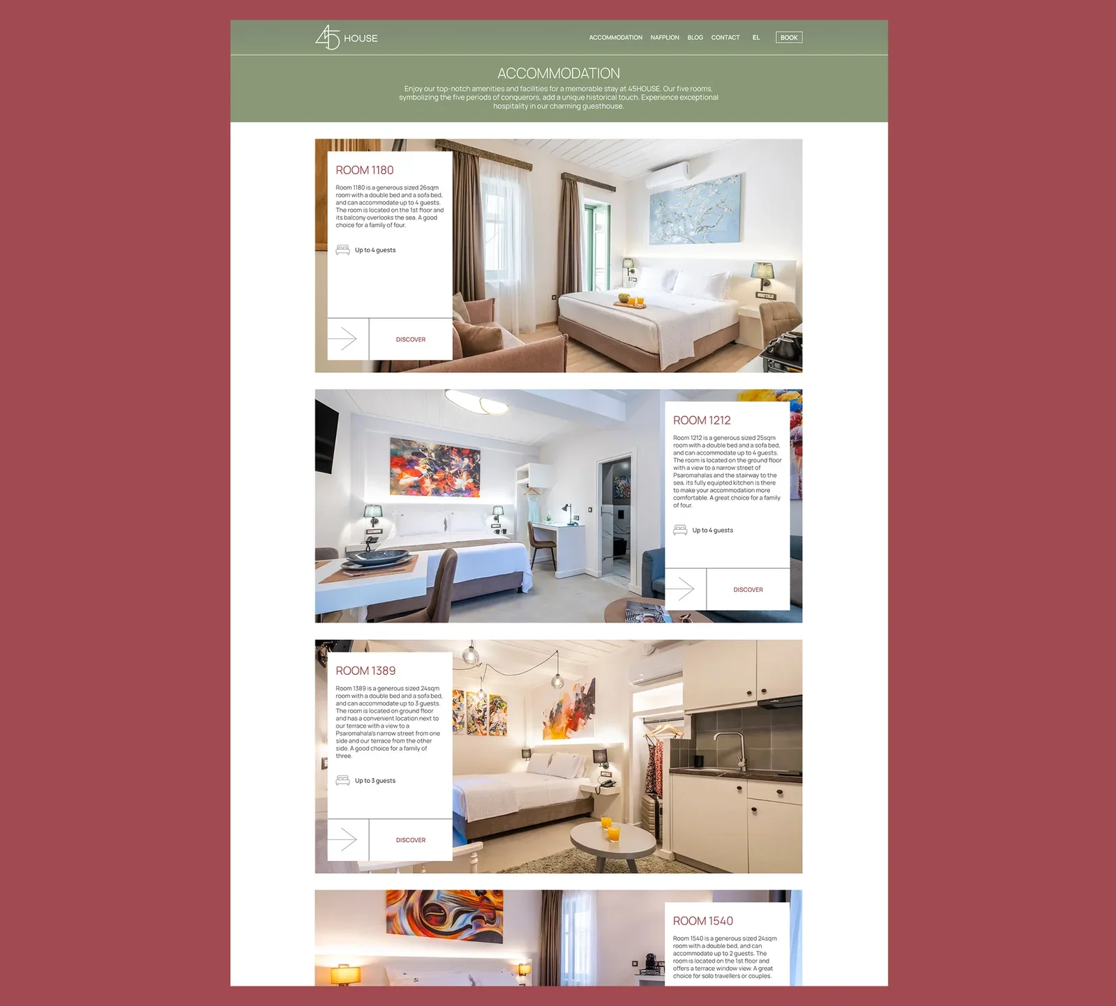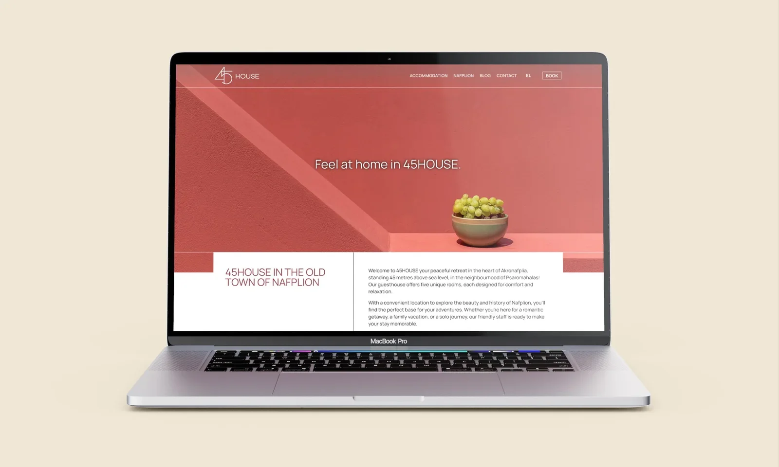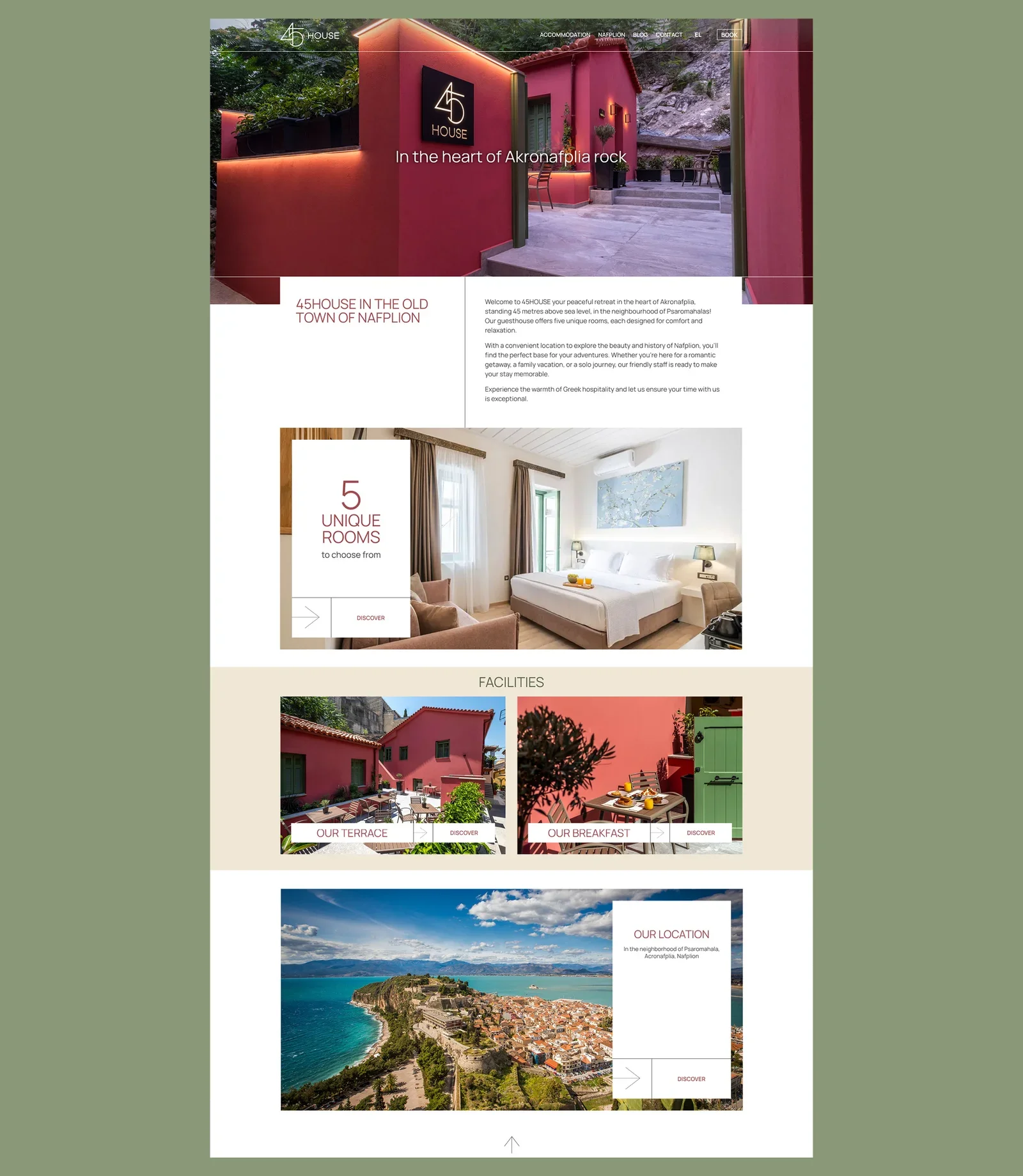 For 45house, we developed a complete brand and digital presence inspired by its unique location beneath the 45-metre rock of Acronauplia. The name and logo draw from this landmark, while the room names reflect key historical periods and conquerors of Nafplio. Our work included full brand identity, website design with AI-enhanced direct booking functionality, digital marketing, social media management, and ongoing operational support—creating a cohesive, story-driven experience across all touchpoints.